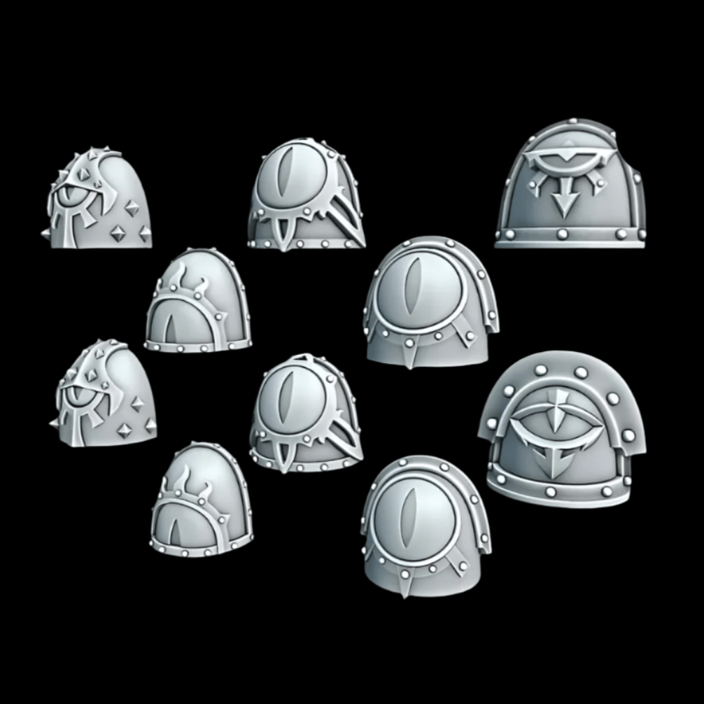 Upgrade your Sons of Horus with these custom pads in a mix of armour mark styles. Perfect for showing your allegiance to the Warmaster. These pads are richly detailed with multiple variations of the eye symbol and spikes.