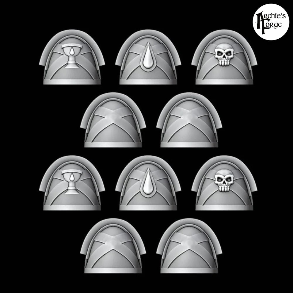 These shoulder pads are compatible with Assault Intercessor models for converting them to the Legio Sanguine Death Company. These pads include skull, blood drop and chalice iconography and each is embossed with the Death Company cross for easy painting.