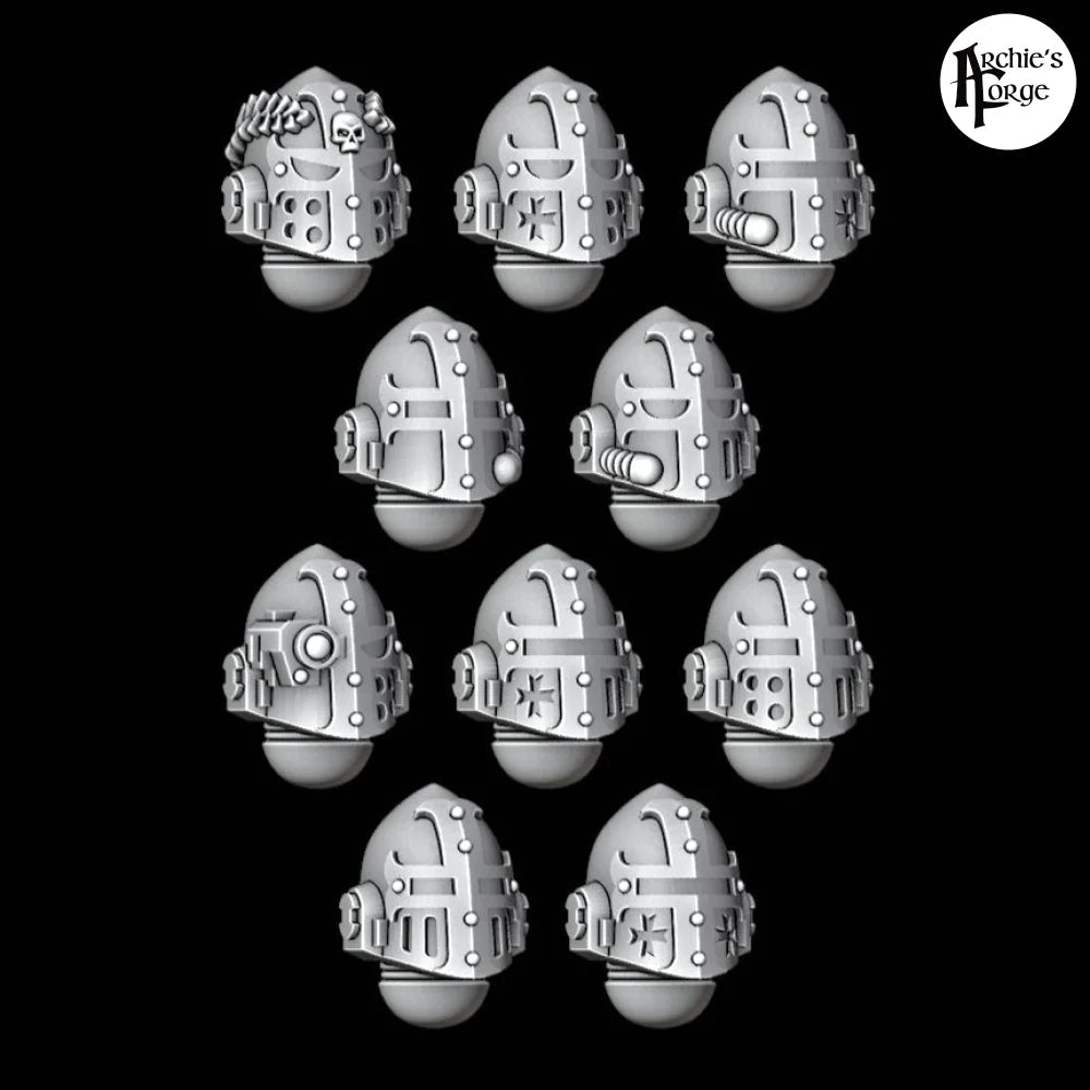 These crusader style helmets are ideal for upgrading your Templar models. With a cross shaped visor these pointed helmets are easy to paint with recessed details for easy use of washes. These helmets are compatible with both Primaris and Firstborn models.