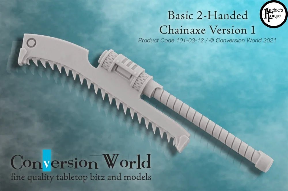 A 2-handed Chainaxe with an elongated axe head. The perfect weapon for the turmoils of futuristic melee battles.